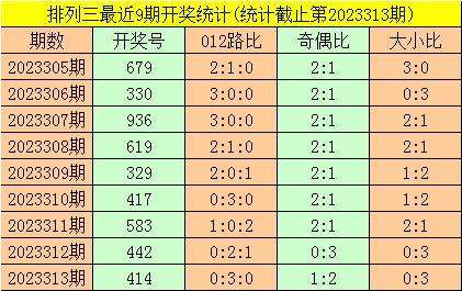 二、体彩排列三前9期奖号开出:679-330-936-619-329-417-583-442-414,其中奖号大小比为11:16,012路比为13:10:4,奇偶比为15:12;