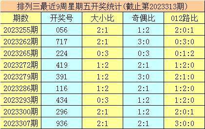 三、体彩排列三前9周星期五奖号分别开出:056-717-224-419-391-116-434-296-936,其中号码012路比为12:11:4,奇偶比为15:12,大小比为11:16;