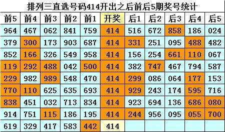 四、排列三直选号码414历史上开出9次,其前后五期奖号分别为: