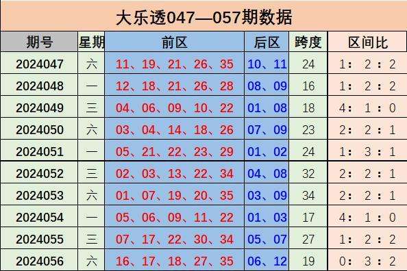 大乐透上期奖号为:前区16 17 18 27 35,后区06 12;前区号码区间比0:3:2,跨度19。