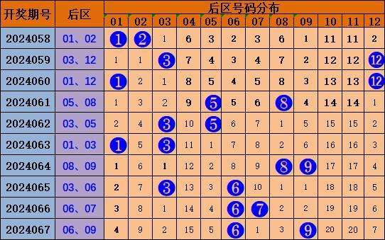 上期开出号码06 09为偶奇形态,近10期后区奇奇形态2次,奇偶形态5次,偶偶形态0次,偶奇形态3次,综合分析,本期预测推荐后区以偶偶形态开出,推荐号码08 12。