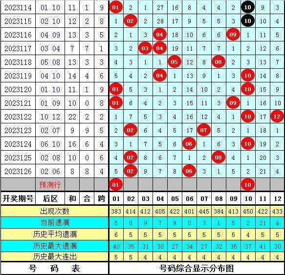 后区分析:后区上期开出号码02+06,和值为8,跨度为4。最近10区后一区(01-06)开出11个号码,断区1次,后二区(07-12)开出9个号码,断区2次,本期后一区注意号码:01;后二区注意号码:08、09、10、11、12。