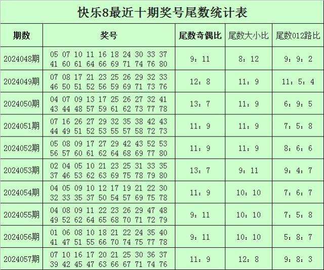 福彩快乐8第2024057期开奖回顾:07 10 16 17 20 21 25 30 36 37 39 42 45 47 63 66 67 71 74 76,其中奖号尾数012路比为9:8:3,尾数大小比为12:8,奇偶比为11:9。