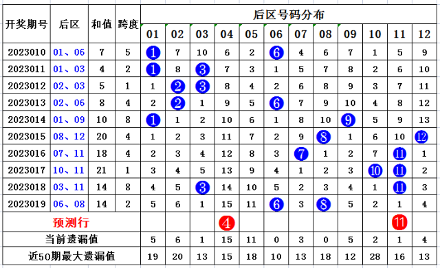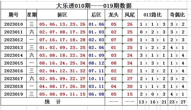 上期回顾,大乐透第2023019开奖,本期奖号:前区05 08 09 11 15;后区06 08,当期前区号码大小比为0:5,三区比4:0:1,奇偶比4:1。前区开出连号08 09,开出重号08。