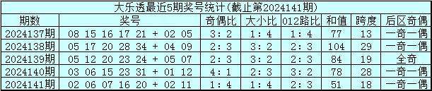 体彩大乐透第24141期奖号为:02 06 07 16 20+02 11,前区奇偶比为1:4,大小比为1:4,012路比为1:2:2,和值为51,跨度为18,后区开出一奇一偶组合。