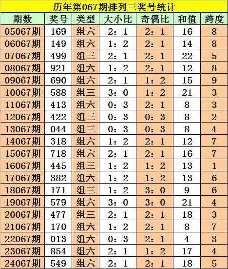排列三第2024067期奖号:549,和值18,跨度5,大小比2:1,奇偶比2:1。