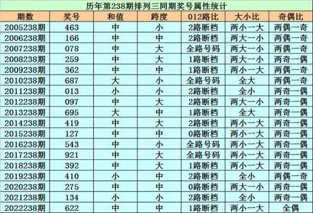 历史上第2023238期排列三已开出18期奖号了,历年同期奖号分别为:463、166、078、259、362、687、013、097、695、419、127、543、921、392、410、275、134、622,详细统计见下表:
