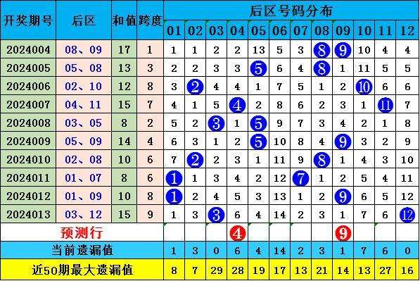 最近50期后区开出奇偶组合形态:奇奇8,奇偶16次,偶奇10次,偶偶16次。其中,奇偶、偶偶组合走热。综合分析,本期单挑推荐04 09。