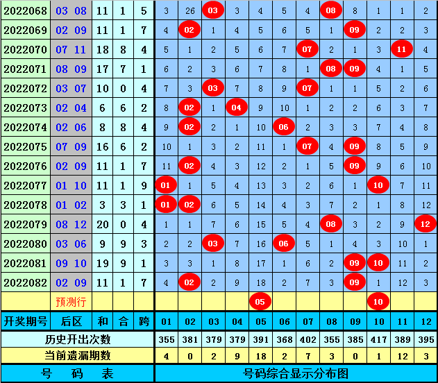 后区分析【一区01-04,二区05-08,三区09-12】:上期后区奖号为02和09,分别落在第一、三区,近50期后区三区比为29:37:34,近10期三区比为9:4:7,本期注意第二、三区号码出现,关注两码05+10。