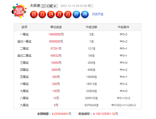 大乐透第22143期开奖。当期开奖号码为:前区10 13 14 27 33,后区07 08。当期前区号码大小比为2:3,奇偶比为3:2,三区比1:2:2,前区开出一枚重号14,开出1组连号13 14;后区开出大大组合07 08。