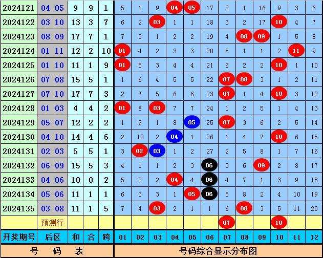 后区号码分析:在第136期历史同期开奖中奖,奖号11出现5次,奖号03出现4次,奖号04 05 06出现3次,奖号01 02 07 09 10出现2次,奖号08 12出现1次。本期后区五码参考03、04、06、07、10。