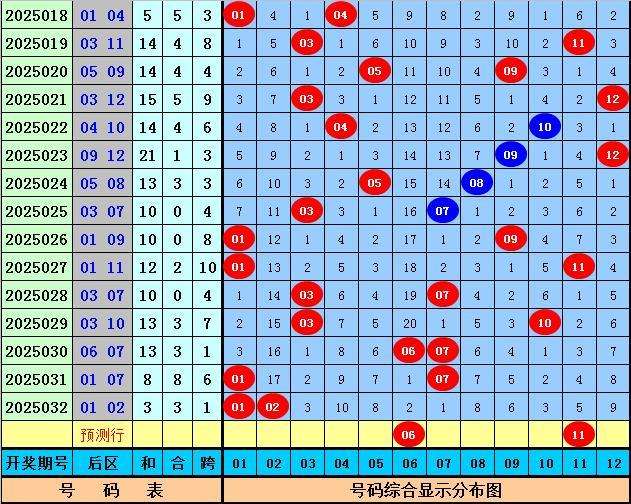 后区分析:上期后区奖号为01+02,开出全小组合,上周六后区奖号开出06+07,最近十周六后区奖号大小比为10:10,大小 号码走势基本相当,本周六看好大小 号码继续平衡,关注两码06、11。