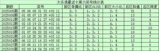 前区奇偶走势:上期前区奇偶比为2:3,上周六前区奇偶比2:3,最近十周六奇数号码表现占优,本期看好奇数号码继续走热,推荐奇偶比4:1。