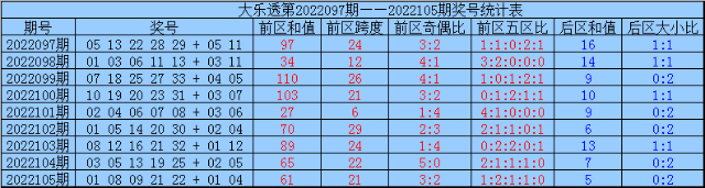 大乐透第2022105期奖号为:01、08、09、21、22 + 01、04。其中前区和值为61,跨度为21,奇偶比为3:2,五区比为1:2:1:1:0。后区和值为5,大小比为0:2。