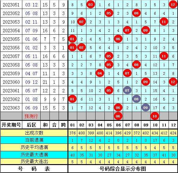 后区分析:上期后区开出奖号06+09,为一大一小、一奇一偶组合,最近9期后区号码大小比为8:10,奇偶比为11:7,本期后区号码大范围参考06、07、08、10、12,精选两码06、10。