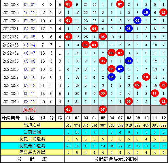 后区上期开出奖号:08+12,前6次后区奖号08+12出现之后,其下期分别开出号码:06+12、08+09、08+10、05+08、03+09、03+04,本期后区注意五码01 05 06 08,单挑两码01 05。