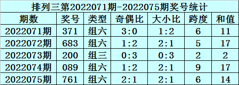 跨度分析:最近5期分别开出跨度:6、8、3、4、5,本期预计跨度走大,一码跨度参考6。