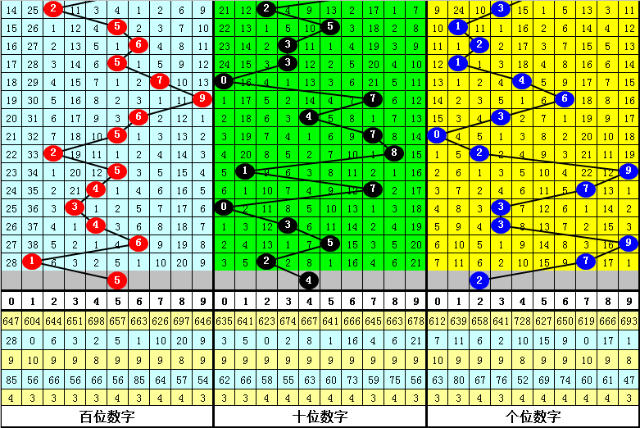 十位:上期为2,近10期012路比为2:5:3,其中2路号连出2期,本期排除2路号,关注1路号,参考4。