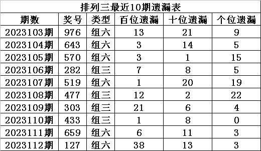 上期回顾:排列三第2023112期奖号:127,组六,直选遗漏总值为54期。