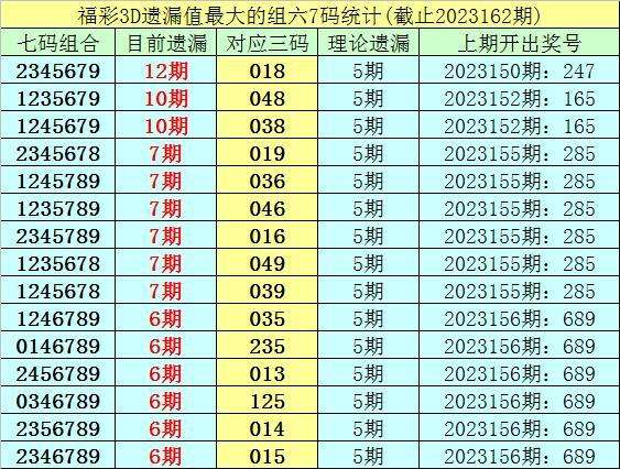 1。截止第23162期,七码组六遗漏最大的是:2345679,当前遗漏12期。