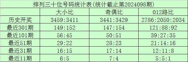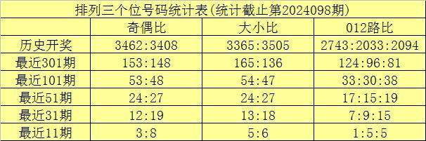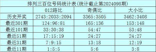 上期回顾:排列三第2024098期奖号为:247。奖号形态组六,大小比1:2,奇偶比1:2,012路0:2:1。
