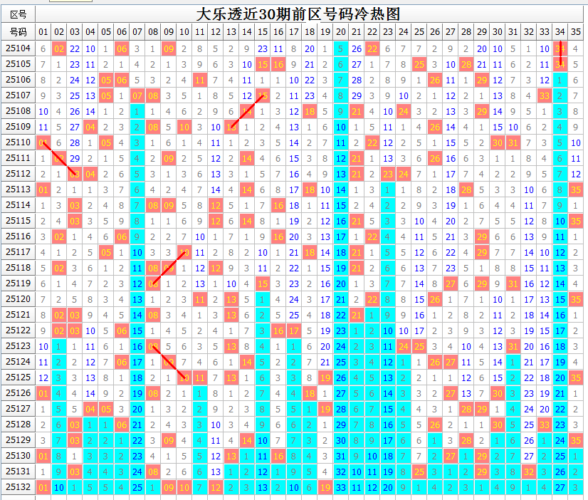 大乐透近30期前区号码冷热图(数字为遗漏期数,蓝色标记的为遗漏超过10期的大冷号)