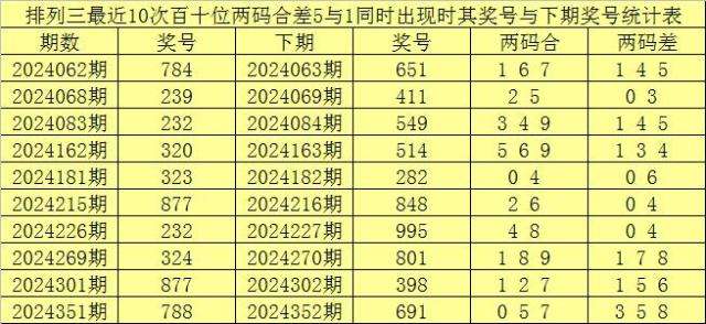 百十位合差分析:上期奖号百十位开出78组合,两码合为5,两码差为1,最近10次百十位两码合5与两码差1同时出现时,其奖号和下期奖号分别为: