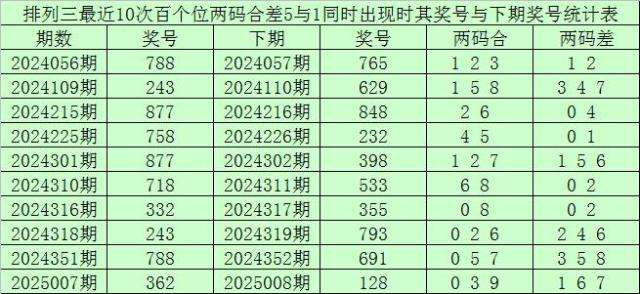 百个位合差分析:上期奖号百个位开出78组合,两码合为5,两码差为1,最近10次百个位两码合5与两码差1同时出现时,其奖号和下期奖号分别为: