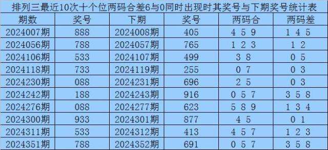 从以上统计可以看出,十个位两码合差6与0同时出现之后其下期两码合差表现最热的4个分别为:0135,本期十个位两码合差可以参考这四码中的数据。