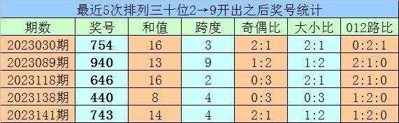 1、最近两期排列三十位号码开出号码分别为2和9,历史上十位号码连续两期同时出现号码2和9的奖号共开出64期。最近五次下期开出号码为:754、940、646、440、743;