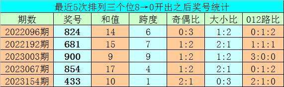 1、排列三前两期个位分别开出号码8和0,历史上个位号码连续两期分别出现8和0时,共有77次。在最近5次出现时,其下期分别出现号码:824、681、900、854、433;