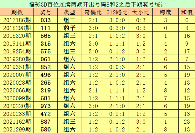 百位号码:连续两期百位出号分别为:8-2,历史上福彩3D连续两期前后分别出号8-2的奖号共出现73次。在百位8-2的奖号现象出现时,近15期下期分别出号:033-111-565-315-575-061-852-496-265-219-681-973-472-887-580;