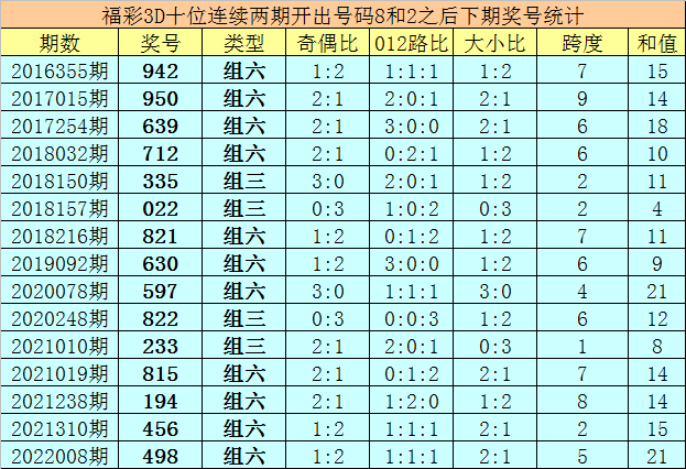 十位号码:前两期十位分别出现奖号8-2,历史上福彩3D连续前后分别开出号码8-2的现象共开出62次。在十位8-2的现象出现时,最近15期其下期分别开出号码:942-950-639-712-335-022-821-630-597-822-233-815-194-456-498;