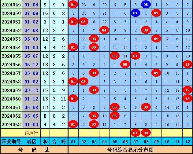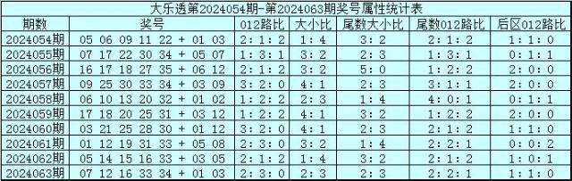 体彩大乐透第24063期奖号为:07 12 16 33 34+01 03,其中前区奖号012路比为2:3:0,大小比为2:3,奇偶比为2:3,没有同尾奖号。