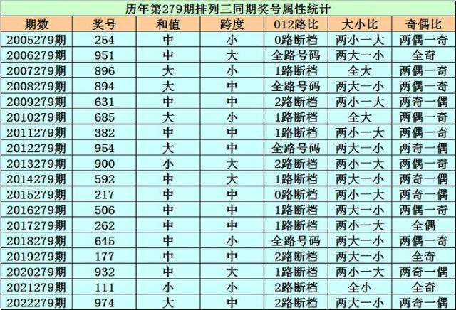 历史上第2023279期排列三已开出18期奖号了,历年同期奖号分别为:254、951、896、894、631、685、382、954、900、592、217、506、262、645、177、932、111、974,详细统计见下表: