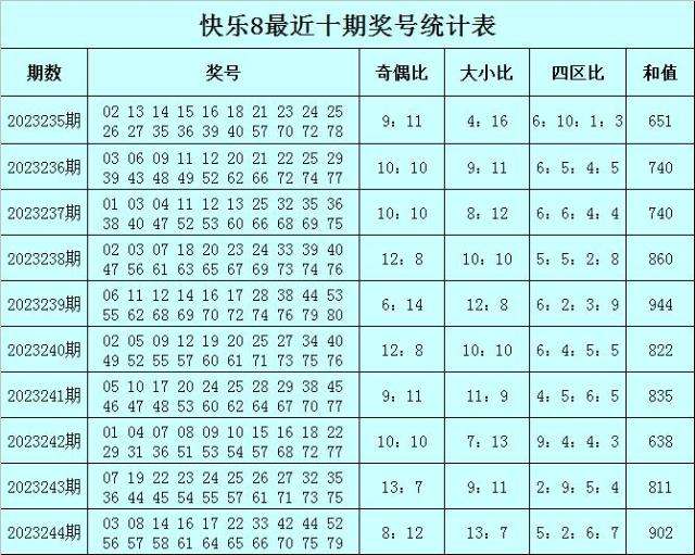 福彩快乐8第2023244期开奖回顾:03 08 14 16 17 22 33 42 44 52 56 57 58 61 64 65 66 70 75 79,其中奖号四区比为5:2:6:7,奇偶比比为8:12,大小比为13:7,和值为902。