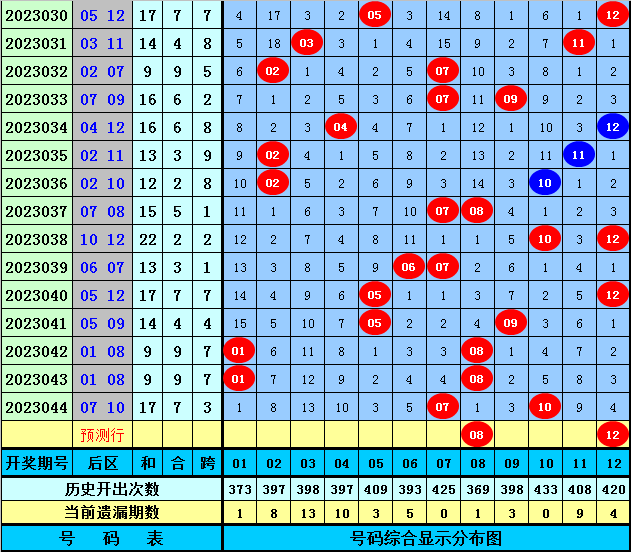 后区分析:上期后区奖号为07和10,最近5期后区和值分别为17、14、9、9、17,后区跨度分布范围在3-7,本期后区注意两码08、12。