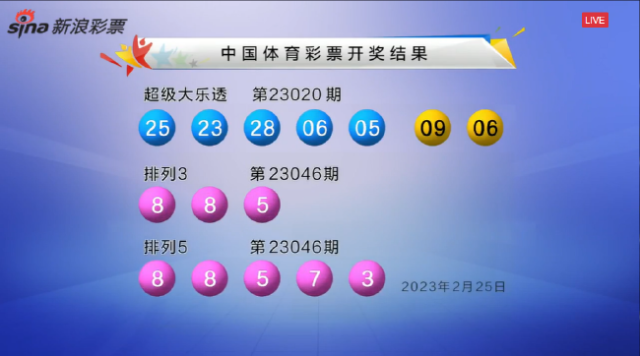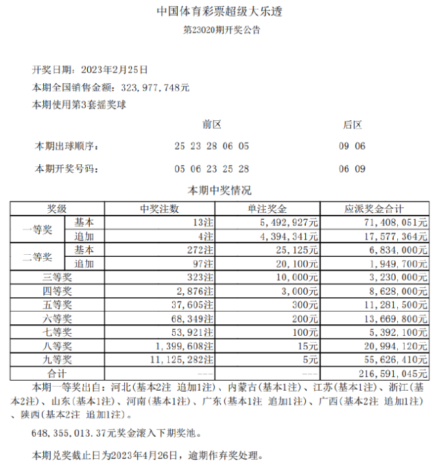 北京时间2月25日晚,体彩大乐透第23020期开奖,当期开奖号码为前区05 06 23 25 28,后区06 09。