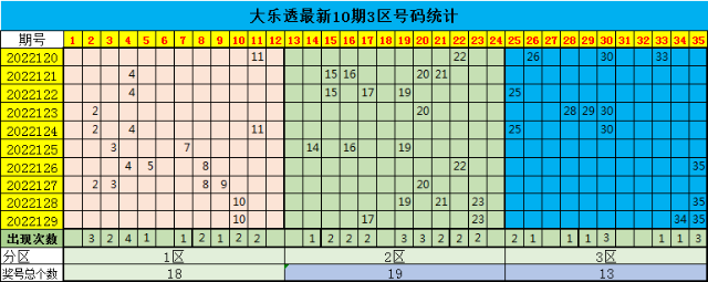 三区(一区1-12,二区13-24,三区25-35)出号个数统计: