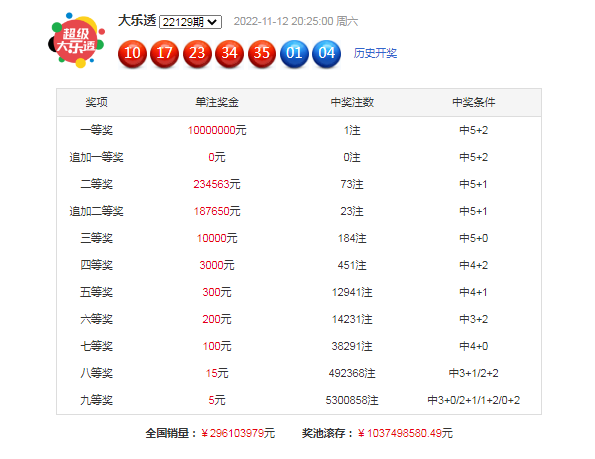 大乐透第22129期开奖。当期开奖号码为前区:10 17 23 34 35,后区01 04。当期前区号码大小比为3:2,奇偶比为3:2,三区比1:2:2;前区开出3枚重号10 23 35,开出1组连号34 35,后区开出小小组合01 04。