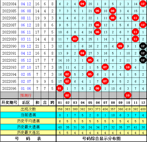 1、后区和值分析:在第097期历史同期奖号中,后区和值分别为:13-5-10-23-3-11-16-5-22-19-5-22-18-13,和值012路比为2:7:5,奇偶比为9:5,大小比为8:6,今年第097期看好出现偶数和值,关注和值12。