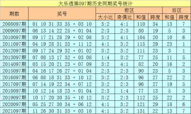 1、前区跨度分析:在第097期历史同期奖号中,前区跨度分布在13-34区段,分布比较广,其中跨度012路比为2:6:6,今年第097期预计开出1路跨度,精选跨度22。