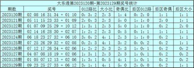 体彩大乐透第23129期奖号为:09 23 25 27 33+06 12,前区奖号012路比为3:1:1,奇偶比为5:0,大小比为4:1,后区为全0路号码。
