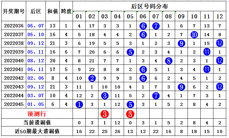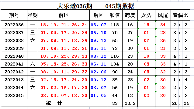 跨度分析:上期跨度18,较044期下降1个点,近5期跨度分别为28、24、28、19、18,本期预计跨度上升10个点位,关注跨度出现在29左右。