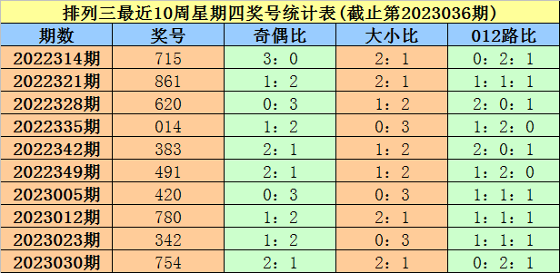 上期回顾:排列三第2023036期奖号为656。其中奖号奇偶比为1:2,大小比为3:0,012路比为2:0:1。