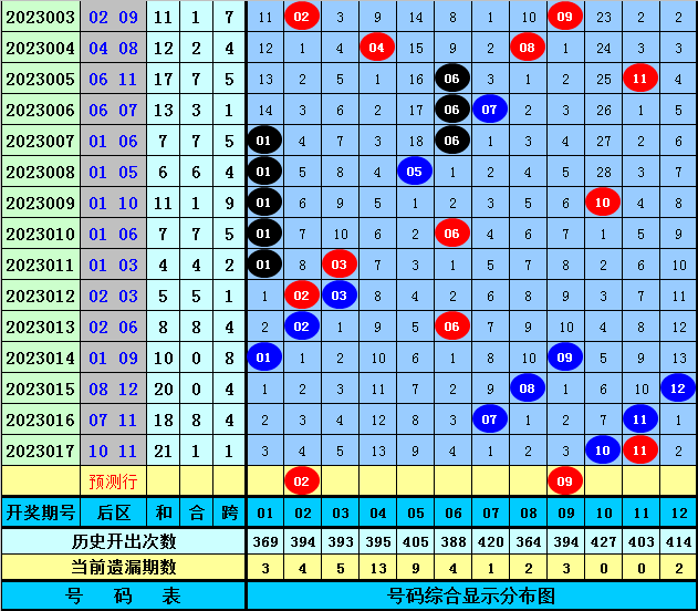 大乐透第2023017期开出奖号为02、05、09、22、27+10 11。其中前区奇偶比为3:2,三区比为3:1:1,大小比为2:3,后区为全大组合。