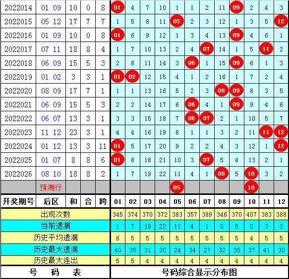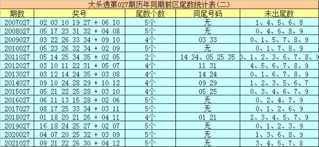 大乐透历年同期第027期后区尾数奇偶比为13:17,最近5年尾数奇偶比为6:4,后区尾数大小比为11:19,最近5年尾数大小比为2:8,本期后区注意号码01、05、09、10、12,后区两码关注05、10。