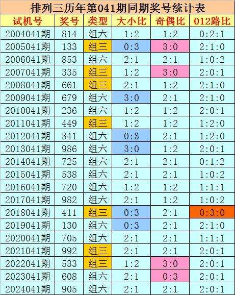 组选类型推荐:历史上排列三第041期同期奖号中,组六出现14期,组三出现7次,今年第041期预计奖号为组六号码。