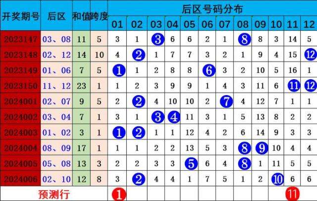 上期开出后区号码:02 10,热冷组合。冷热分析:近十期,冷冷组合2次,热冷组合3次,冷热组合3次,热热组合2次,总体冷冷 热热组合出码较冷,综合分析,本期预测热冷组合后区回补,关注号码01 05 08 09 11。精准推荐:01 11。