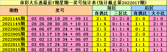 上期回顾:体彩大乐透第2022017期开出奖号10 14 18 23 25 + 07 11,其中前区奖号奇偶比为2:3,三区比为1:3:1,后区奖号奇偶比为2:0,大小比为2:0。
